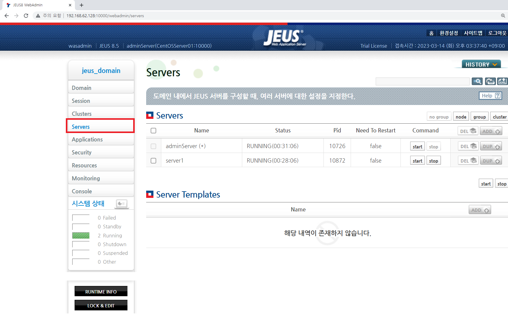 만약, 정상적으로 기동되지 않는 경우, NodeManager가 기동 되어 있는지 확인합니다. NodeManager가 기동되어 있지 않으면 webadmin에서 MS가 기동되지 않습니다.