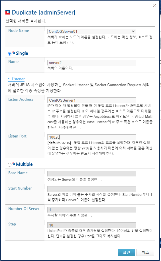 팝업창에서 Node Name, Name, Listen Address, Listen Port 값을 설정 후 확인 버튼을 클릭하여 server2를 생성합니다.