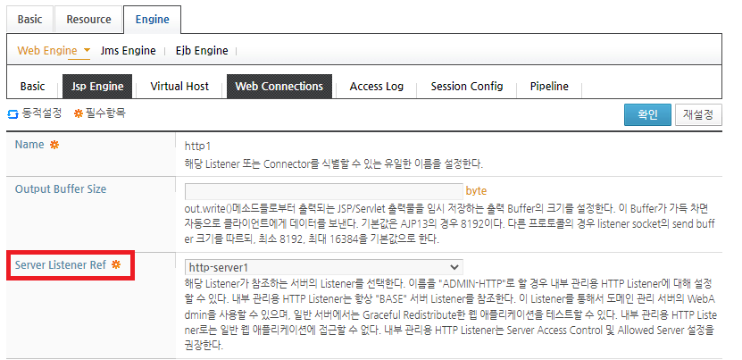 기존에 http1 이름을 가진 엔진이 존재하면 http1 이름을 클릭 수 Server Listener Ref 항목을 리스너 설정에서 추가했던 리스너 이름을 지정해주면 됩니다.