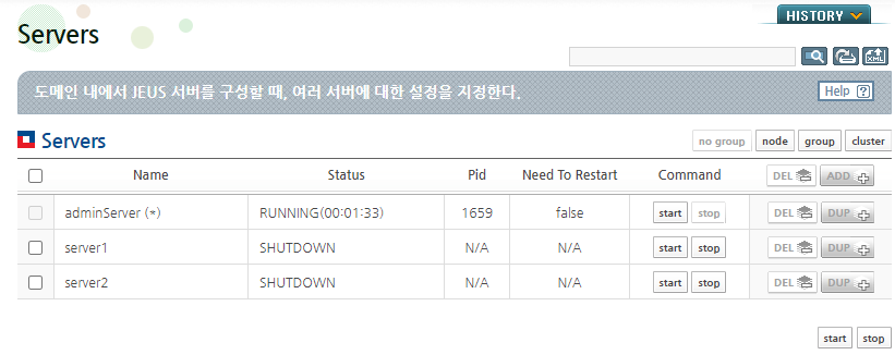 모든 설정이 완료되었으므로 MS를 기동할 수 있습니다. Servers 메뉴에서 새로 추가한 MS 를 Start 버튼을 눌러 기동하면 됩니다.