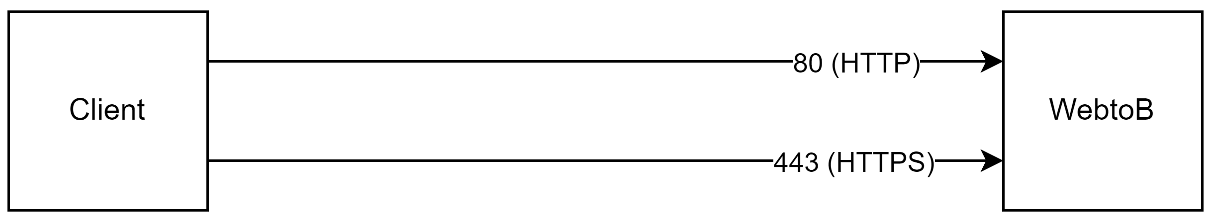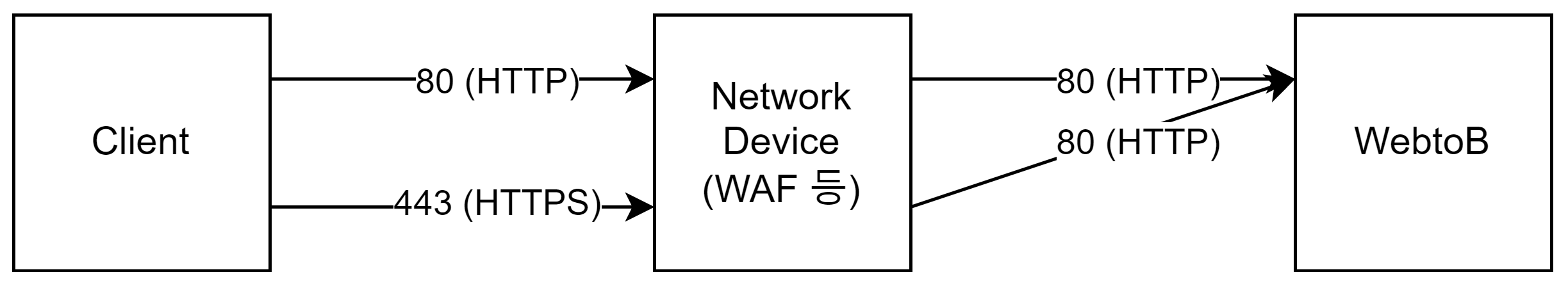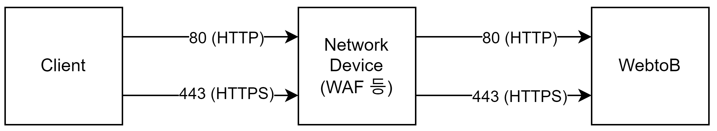 Client와 WebtoB 사이에 중간 네트워크 장비 (WAF 등)가 있으나, 80 포트(HTTP) 접속 시 WebtoB 의 80 포트로, 443 포트(HTTPS) 접속 시 WebtoB 의 443 포트로 포트 변경 없이 그대로 연결되는 경우