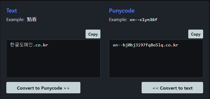 도메인은 ASCII 문자를 사용하기 때문에 한글도메인을 사용하는 경우 Punycode로 변환해야 사용할 수 있습니다.